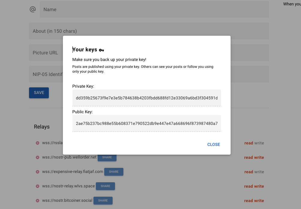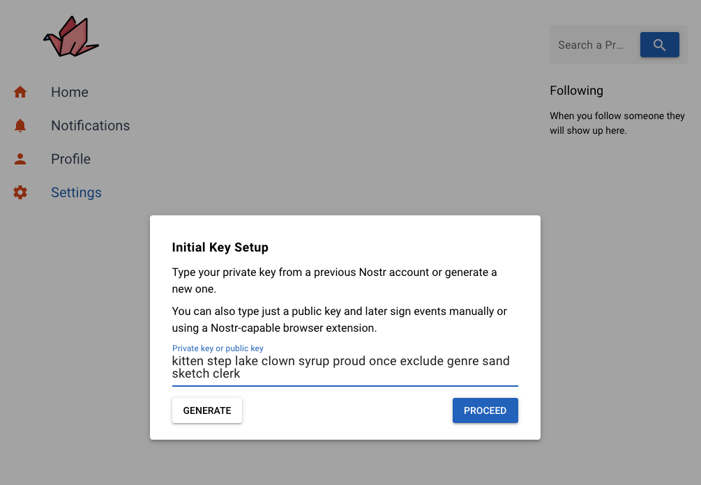 Before I go any further, I want to verify that my backup key works so I delete the key (see the bottom of the page) then regenerate it by entering my original 12 words again. If all is as it should be, I rejoice, safe in the knowledge that I - along with dissidents and independent voices across the world - can now carry the keys to permissionless, decentralised speech using nothing more than some choice words and a pattern in my head.