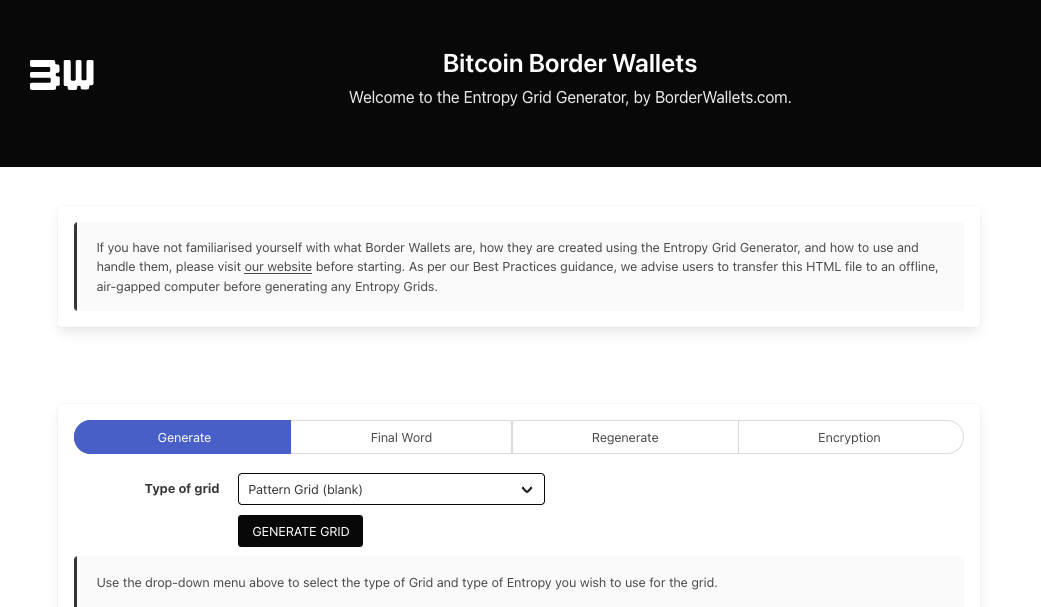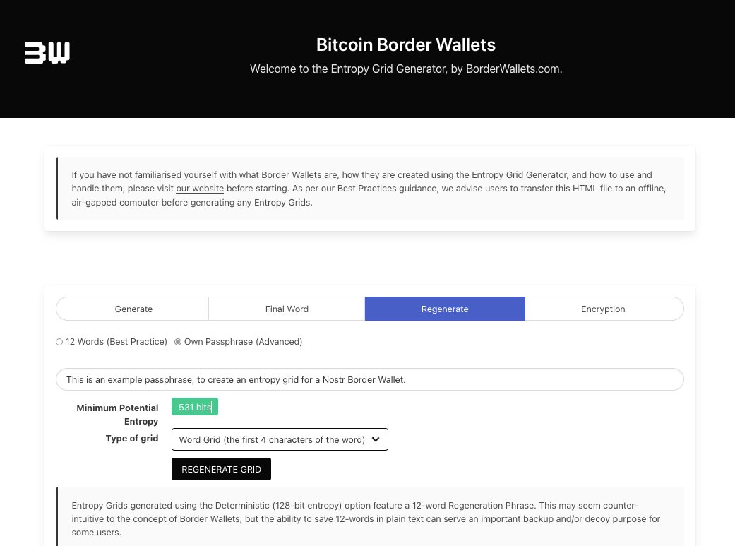 I’m going to use the EGG’s “Regenerate” feature and use my own Regeneration/Recovery Phrase to generate the grid. The Regeneration Phrase I use for this demo is “This is an example passphrase, to create an entropy grid for a Nostr Border Wallet.”