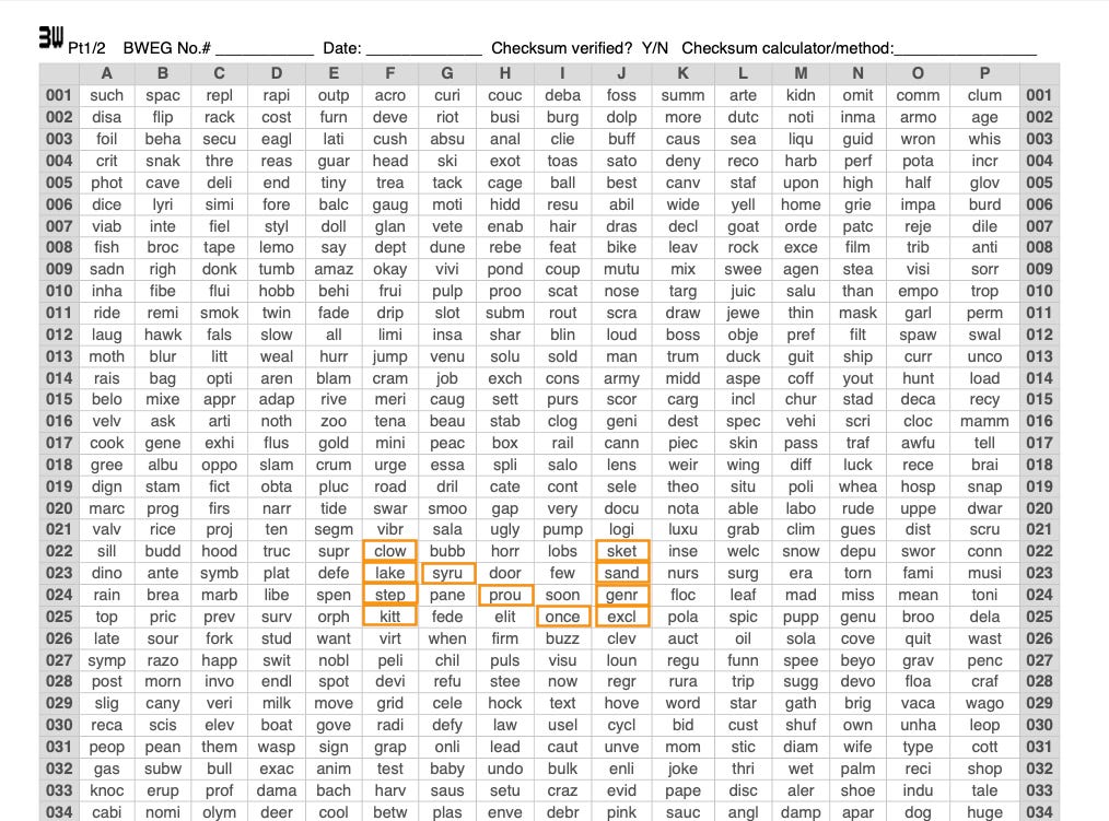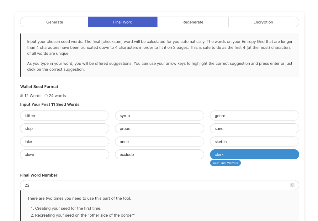 Upon entering the 11th word - in this case “sketch” - I am offered a 12th ‘checksum’ word by the EGG. I dedide to use the Final Word Number feature and scroll to number 22 - so it’s easier for me to remember. That changes the checksum to “clerk”.